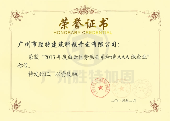 2013年度白云區(qū)勞動關系和諧AAA級企業(yè)-廣州市勝特建筑科技開發(fā)有限公司資質(zhì)證書展示,勝特加固公司榮譽一覽.我司專注于危房加固,橋梁承臺加固等工程設計及施工,擁有建筑加固資質(zhì),加固資質(zhì)證書等一系列特種工程資質(zhì).公司加固技術實力雄厚,國家高新技術企業(yè),獲2013年度白云區(qū)勞動關系和諧AAA級企業(yè)稱號!歡迎來電咨詢加固工程業(yè)務