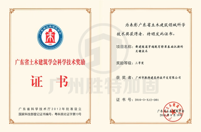 “新建隧道穿越既有橋梁基礎(chǔ)托換的關(guān)鍵技術(shù)”榮獲2016年度廣東省土木建筑學(xué)會科學(xué)技術(shù)獎(jiǎng),科學(xué)技術(shù)獎(jiǎng)勵(lì)證書-廣州市勝特建筑科技開發(fā)有限公司資質(zhì)證書展示,勝特加固公司榮譽(yù)一覽.我司專注于危房加固,橋梁承臺加固等工程設(shè)計(jì)及施工,擁有建筑加固資質(zhì),加固資質(zhì)證書等一系列特種工程資質(zhì).公司加固技術(shù)實(shí)力雄厚,國家高新技術(shù)企業(yè),獲科學(xué)技術(shù)獎(jiǎng)勵(lì)證書!歡迎來電咨詢加固工程業(yè)務(wù)