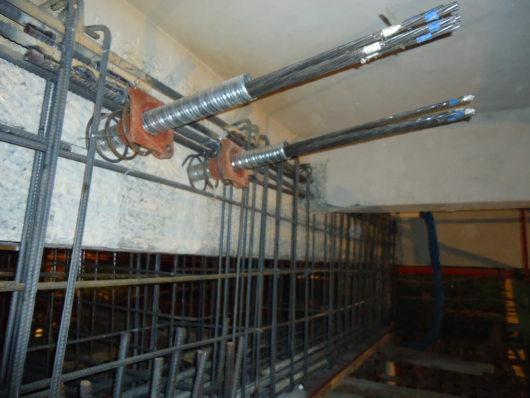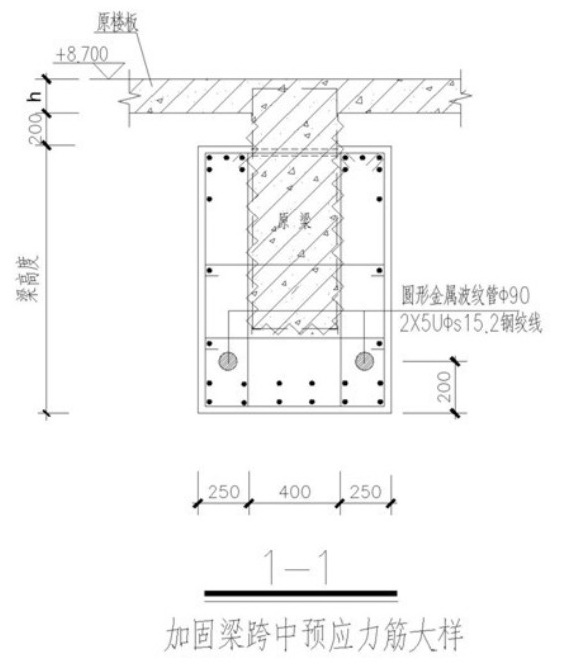3、體內(nèi)預(yù)應(yīng)力施工:預(yù)應(yīng)力加固法的受力特點(diǎn)屬主動受力,主要是通過鋼絞線的張拉,讓混凝土收拉區(qū)主動受力,相當(dāng)于在原構(gòu)件基礎(chǔ)上施加一套與恒載和活載產(chǎn)生的相反效應(yīng)的等效荷載,和原構(gòu)件形成桁架的受力形式,可從根本上提高構(gòu)件的承載能力和控制裂縫及撓度,并縮小甚至閉合裂縫。本工程采用體內(nèi)預(yù)應(yīng)力,進(jìn)一步解決了體外預(yù)應(yīng)力防火及后期維護(hù)和耐久性問題。