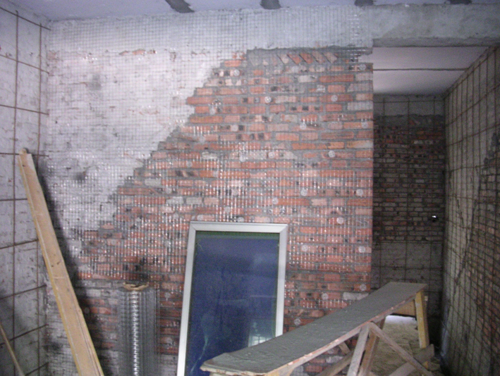 對于抗震驗算需配筋的墻體:先將原粉刷層打掉,清除松散砂漿及浮灰,水沖無浮灰;按設計要求掛鋼筋網(wǎng),用M10水泥砂漿抹面35厚內(nèi)摻水泥用量1%礦棉纖維。