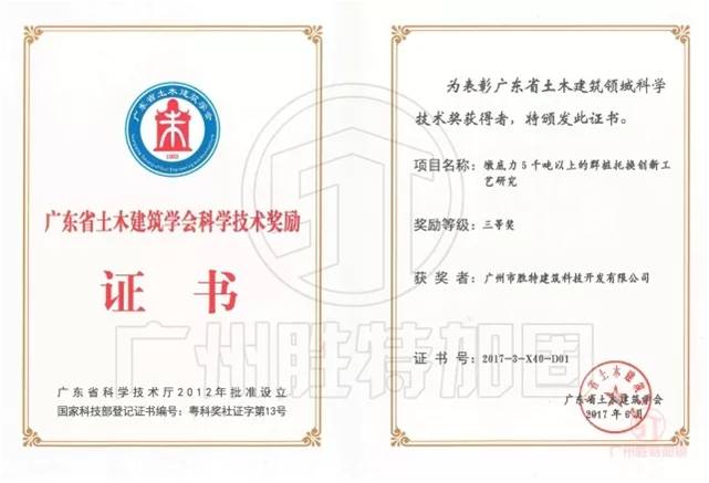 本創(chuàng)新技術(shù)是在傳統(tǒng)錨桿靜壓樁技術(shù)基礎(chǔ)上的巨大突破, 創(chuàng)新點(diǎn)包括: 1. 根據(jù)工程實(shí)際情況因地制宜的組合使用“群錨靜壓樁結(jié)構(gòu)”(專利號ZL201120281350.1)和“建筑物厚板基礎(chǔ)結(jié)構(gòu)豎直樁托換加固封樁孔方法”(專利號ZL200910235342.0)、“樁基加固預(yù)應(yīng)力鎖樁方法” (專利申請?zhí)枺?00710305695)3項新工藝,可以達(dá)到工程設(shè)計的單樁承載力較高這一要求--達(dá)到2500KN,超過了中型壓樁機(jī)(壓樁力≤2400kN)。 2. 室內(nèi)地坪提供的反力荷載隨時隨地可利用。 3. 不受室內(nèi)高度的限制,可在高度2m以下空間施工;施工方便可拆卸移位置,安全可靠、簡單易行。 項目第一完成人是我司董事長兼總工,高級工程師吳如軍。 《勝特特刊》秉承著“增強(qiáng)企業(yè)凝聚力,弘揚(yáng)企業(yè)文化”的宗旨,使其成為勝特人傳承行業(yè)文化、企業(yè)文化、生活文化的有效途徑,把公司的最新動態(tài)展現(xiàn)給廣大友人。 本屆創(chuàng)交會5月26日至27日如期在廣州琶洲國際會展中心舉辦,我司有2項入選參展項目,分別為加固改造、托換糾傾領(lǐng)域綠色技術(shù)與一種地下圓形停車庫(四季快安智能停車場)。 十九年來,公司以科研推動施工技術(shù)進(jìn)步,以施工技術(shù)實(shí)踐轉(zhuǎn)換科技成果,通過不斷的技術(shù)創(chuàng)新,不但具有較強(qiáng)的開發(fā)與設(shè)計能力,更具有較高的現(xiàn)場施工能力。每年完成各種加固與改造、托換與糾傾及邊坡加固等工程二百余項,至今已完成三千余項特種工程設(shè)計與施工,攻克了一個又一個的技術(shù)難題。公司本著“優(yōu)勝、特別、務(wù)實(shí)、開拓”的企業(yè)精神,艱苦創(chuàng)業(yè),力求精益求精,做到了人無我有,人有我優(yōu)。 相繼獨(dú)立完成了多項重大加固改造托換工程,業(yè)務(wù)范圍遍及全國各地,取得了很高的知名度與滿意度,樹起了良好的公司品牌形象,將“勝特”打造成中國加固改造行業(yè)的優(yōu)質(zhì)品牌。