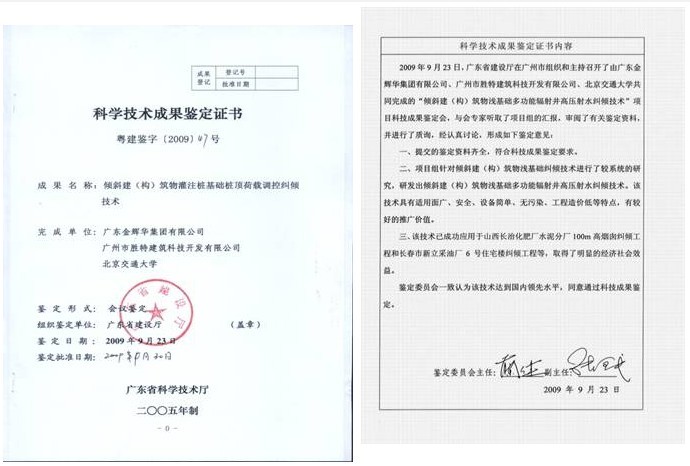 本技術(shù)于2009年9月23日榮獲廣東省建設(shè)廳鑒定的科技成果鑒定證書,鑒定結(jié)果為國內(nèi)領(lǐng)先水平。本技術(shù)適用于具有灌注構(gòu)筑物糾傾,糾傾時在相反一側(cè)設(shè)計斷樁區(qū)域調(diào)整千斤頂?shù)纳灯仁沟郊m傾目的。現(xiàn)已申請國家實用新型專利,且已成功應用于我司的東莞市正騰工業(yè)園廠區(qū)三A宿舍樓六層建筑物糾傾工程、廣州市農(nóng)村信用聯(lián)社蘿崗信用社糾傾加固工程等。