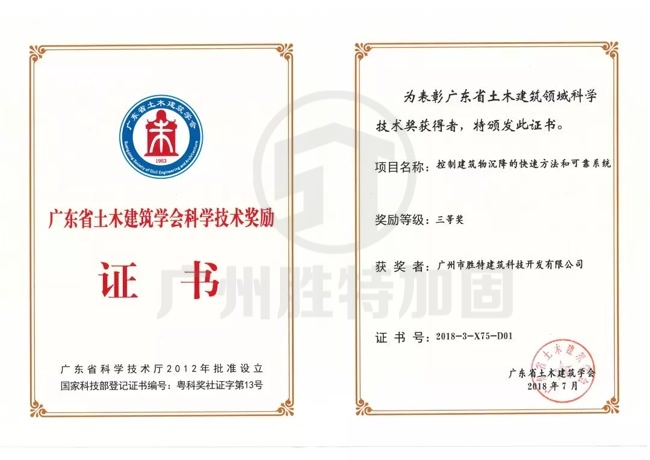 廣州勝特加固公司申報項目“控制建筑物沉降的快速方法和可靠系統(tǒng)”榮獲2018年度廣東省土木建筑學會科學技術三等獎。