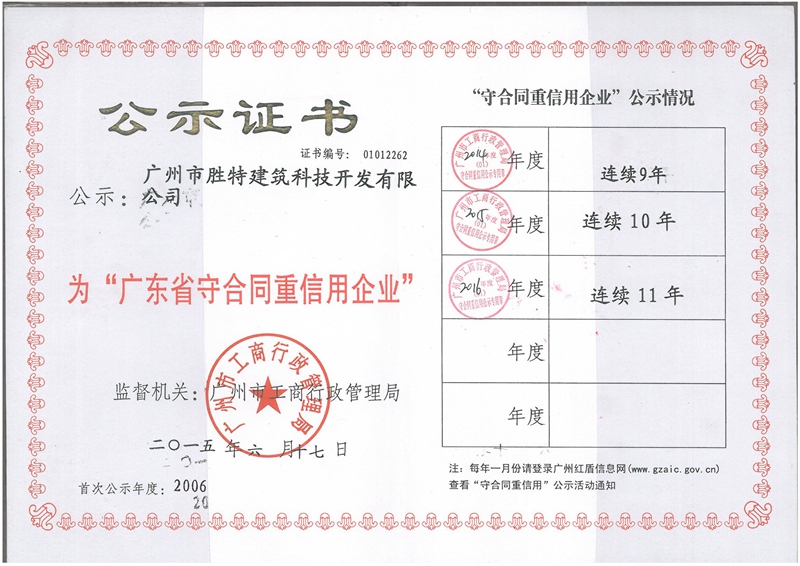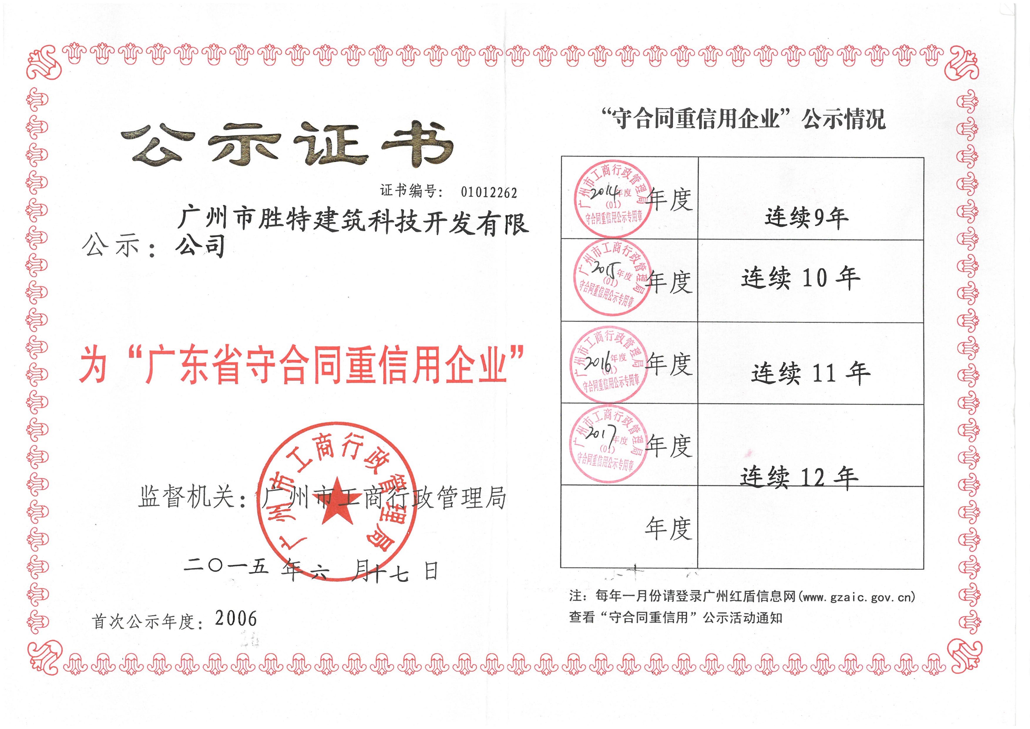 守合同重信用企業(yè)證書-廣州市勝特建筑科技開發(fā)有限公司資質(zhì)證書展示,勝特加固公司榮譽一覽.我司專注于大型設(shè)備基礎(chǔ)加固,電梯井?dāng)U建改造等工程設(shè)計及施工,擁有特種加固資質(zhì),結(jié)構(gòu)加固資質(zhì)等一系列特種工程資質(zhì).公司加固技術(shù)實力雄厚,獲國家高新技術(shù)企業(yè)認(rèn)證!歡迎來電咨詢加固工程業(yè)務(wù)