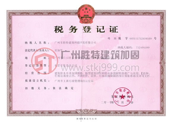 稅務登記證【地稅】-廣州市勝特建筑科技開發(fā)有限公司營業(yè)執(zhí)照與資質證書展示.我司擁有加固改造施工資質,特種專業(yè)工程資質等一系列特種專業(yè)工程資質,專注于橋梁支座更換工程,電梯加固等工程設計及施工.勝特加固加固技術實力雄厚,獲國家高新技術企業(yè)認證!歡迎廣大客戶來電咨詢.