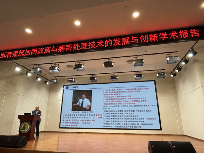 ▲吳如軍董事長(zhǎng)作《既有建筑加固改造與病害處理技術(shù)的發(fā)展與創(chuàng)新》學(xué)術(shù)報(bào)告