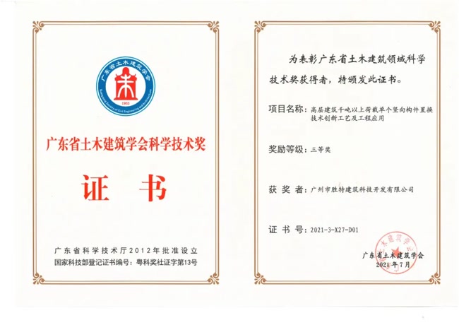近日,廣東省土木建筑學(xué)會公布了2021年廣東省土木建筑學(xué)會科學(xué)技術(shù)獎獲獎名單,我司“高層建筑千噸以上荷載單個豎向構(gòu)件置換技術(shù)創(chuàng)新工藝及工程實(shí)踐應(yīng)用”項(xiàng)目榮獲廣東省土木建筑學(xué)會科學(xué)技術(shù)獎三等獎。