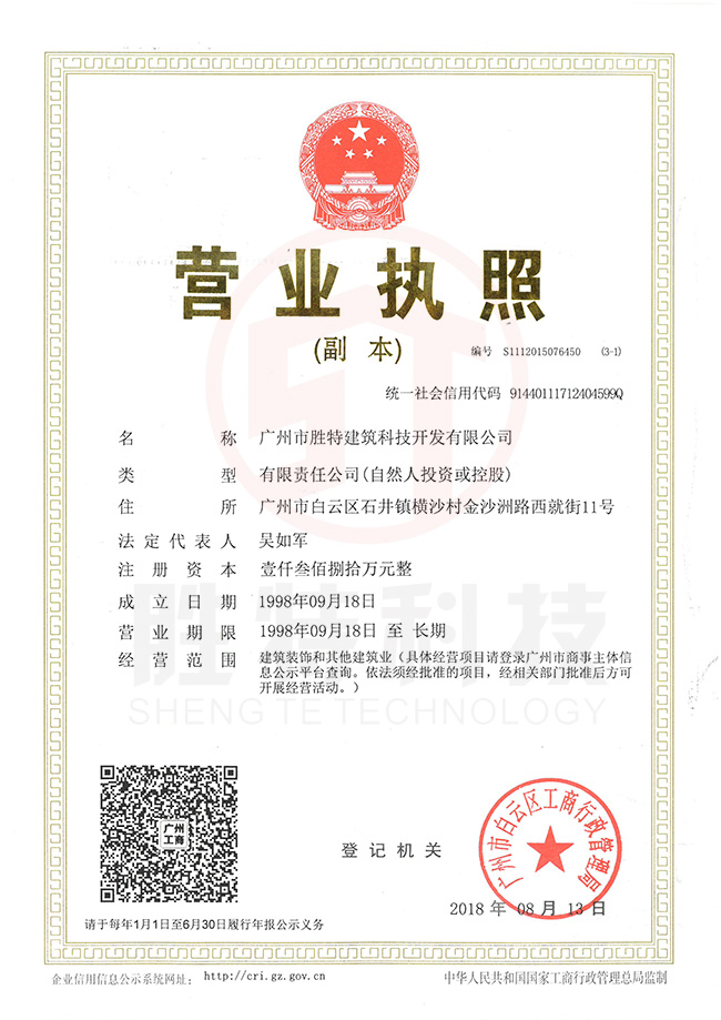 營業(yè)執(zhí)照-廣州市勝特建筑科技開發(fā)有限公司營業(yè)執(zhí)照與資質(zhì)證書展示.我司擁有加固改造施工資質(zhì),特種加固資質(zhì)等一系列特種專業(yè)工程資質(zhì),專注于大型設(shè)備基礎(chǔ)加固,樓板結(jié)構(gòu)補強等工程設(shè)計及施工.勝特建筑加固加固技術(shù)實力雄厚,獲國家高新技術(shù)企業(yè)認證!歡迎廣大客戶來電咨詢.
