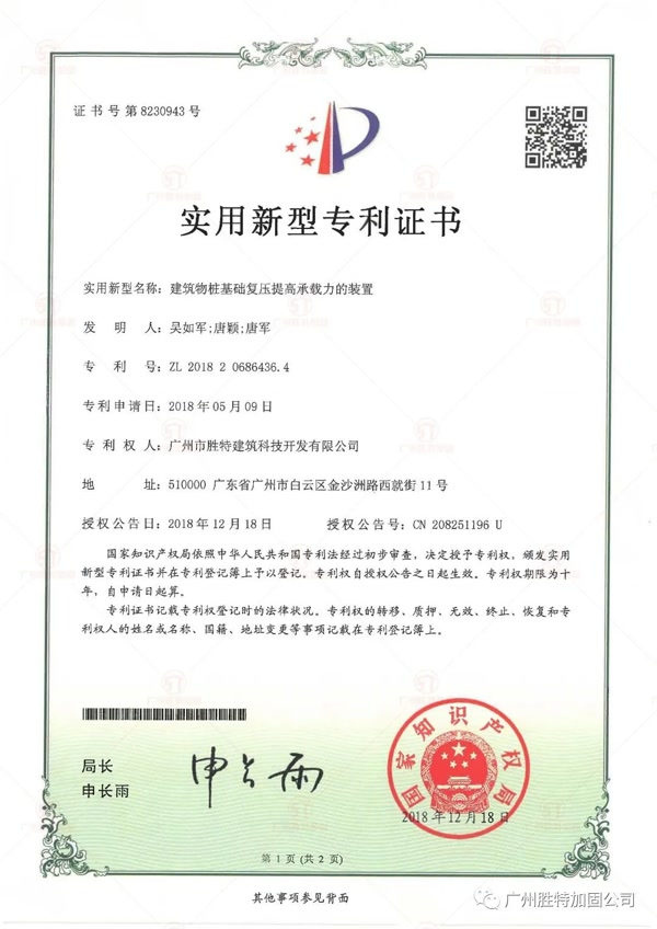 1. “建筑物樁基礎(chǔ)復(fù)壓提高承載力的裝置”(專利號ZL201820686436.4)