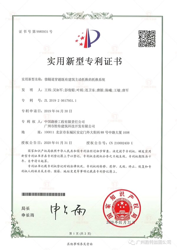 2. “新修隧道穿越既有建筑主動托換的托換系統(tǒng)”(專利號ZL201920617951.1)