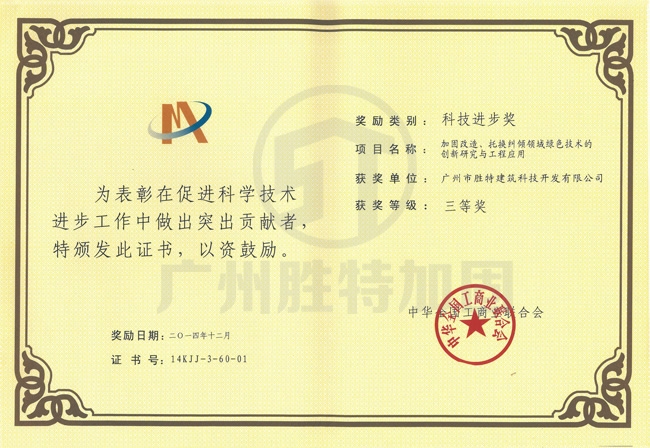 中華全國工商業(yè)聯(lián)合會科技進(jìn)步三等獎-廣州市勝特建筑科技開發(fā)有限公司企業(yè)榮譽(yù)展示。憑著“加固改造、托換糾傾領(lǐng)域綠色技術(shù)的創(chuàng)新研究與工程應(yīng)用”獲得中華全國工商業(yè)聯(lián)合會科技進(jìn)步三等獎,廣州加固公司憑借專業(yè)的技術(shù),獲得了多項(xiàng)榮譽(yù)認(rèn)證.我公司有多年加固工程經(jīng)驗(yàn),專注于樁基托換,教學(xué)樓加固,地基處理,煙囪加固等工程設(shè)計(jì)及施工。