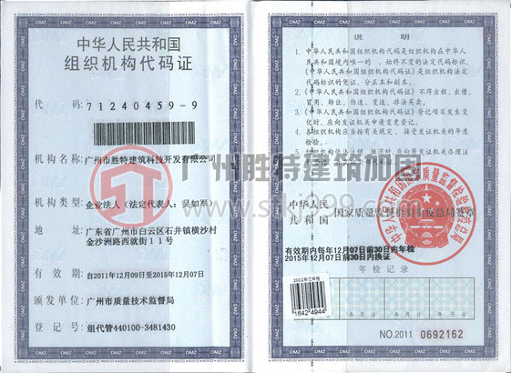 組織機構(gòu)代碼證-廣州市勝特建筑科技開發(fā)有限公司營業(yè)執(zhí)照與資質(zhì)證書展示.我司擁有加固改造施工資質(zhì),建筑加固資質(zhì)等一系列特種專業(yè)工程資質(zhì),專注于廣州加固工程,梁板柱加固改造等工程設(shè)計及施工.抗震加固公司加固技術(shù)實力雄厚,獲國家高新技術(shù)企業(yè)認證!歡迎廣大客戶來電咨詢.