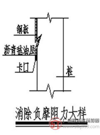 考慮到負摩阻力只發(fā)生在中段和上段兩截樁體,故對中段和上段兩截樁設(shè)置消除負摩阻力裝置。該裝置由鋼板與瀝青隔離層構(gòu)成,樁體用鋼板包裹,鋼板與樁體之間設(shè)置3~5mm的氈油隔離層。鋼板下端加工成卡口狀,鋼板通過其卡口與樁身的卡口相互抵觸。當樁身相對于鋼板向下移動時,樁身卡口抵住鋼板卡口,帶動鋼板向下移動;當鋼板相對于樁身向下移動時,鋼板卡口便與樁身卡口脫離。若往后結(jié)構(gòu)板下部地層發(fā)生沉陷,則鋼板卡口與樁身卡口脫開而自由下沉。由于鋼板與樁之間涂有氈油隔離層,樁側(cè)的摩阻力即可得到消除。為了節(jié)省鋼板材料,每截樁上的鋼板可以分段設(shè)置,每段鋼板下端都有卡口與樁身上的預埋卡口相互抵觸。上、下兩段鋼板之間應留有間隙,間隙的大小可按上、下兩段土層的平均沉降量之差進行估計,自上到下各段鋼板之間間隙因符合地層沉陷上大下小的規(guī)律。鋼板的厚度和卡口強度必須滿足壓樁時樁身帶動鋼板下沉所產(chǎn)生的拉力和剪力。