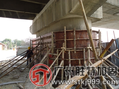 該橋于1993年建成通車,2004-2005年期間,養(yǎng)護(hù)人員發(fā)現(xiàn)該橋的8#墩墩身底部小里程面出現(xiàn)橫向裂縫,之后裂縫一直處于發(fā)展的狀態(tài);2008年8月末,橋梁養(yǎng)護(hù)人員發(fā)現(xiàn)該橋8#墩身向大里程方向傾斜,小里程面底部明顯開裂,需進(jìn)行橋梁裂縫修補(bǔ),混凝土剝落,外露豎向鋼筋被拉斷;2009年3月初,經(jīng)我司建議,養(yǎng)護(hù)人員將8號墩蓋梁上碎渣、污物清理干凈,經(jīng)綜合檢測評估,橋梁總體技術(shù)狀況評定為四類,處于危險,需進(jìn)行大修或改造。受廣州市花都區(qū)地方公路管理總站的委托,由我司承接本項目的施工,對墩身、隔梁、伸縮縫等進(jìn)行了橋梁加固施工,并對橋身增加了預(yù)應(yīng)力施工。