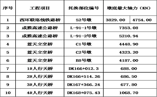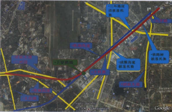 機(jī)場路隧道起止里程為DK165+530~DK170+920,全長5390米。隧道位于成都市區(qū),除三環(huán)路段采用暗挖法施工,其余地段均采用明挖順作法。隧道從成都南站出站后再DK165+530開始下穿,緊沿機(jī)場高速公路左側(cè)行進(jìn),分別下穿西環(huán)聯(lián)絡(luò)線鐵路橋、三環(huán)路藍(lán)天立交橋、三環(huán)路藍(lán)天立交匝道橋、成雅高速公路立交橋共十座橋,托換數(shù)量巨大。