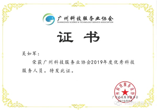 熱烈祝賀我司吳如軍董事長榮獲廣州科技服務(wù)協(xié)會2019年度優(yōu)秀科技服務(wù)人員稱號!“廣州優(yōu)秀科技服務(wù)人員”由市政府委托科技局組織評審指標(biāo)主要是專業(yè)服務(wù)水平、 2019年度服務(wù)業(yè)績、誠信服務(wù)等3個一級指標(biāo),今年獲選名額5名,評審采取定性評審方法,由3位專家進(jìn)行評審,各分值匯總、平均后由高到低分排序,最終選取前五名作為評審?fù)扑]名單上報(bào)市政府批準(zhǔn)。