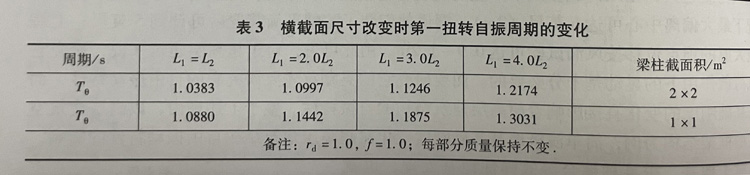 表3橫截面尺寸改變時第一扭轉(zhuǎn)自振周期的變化