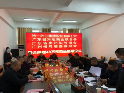 座談會(huì)后,舉行了捐贈(zèng)儀式。由廣東省異地商會(huì)聯(lián)合會(huì)、廣州候鳥慈善基金會(huì)、廣東省貴州畢節(jié)商會(huì)聯(lián)合“特一藥業(yè)集團(tuán)股份有限公司”捐出價(jià)值48萬元藥品,用于公益和幫扶老弱群體。