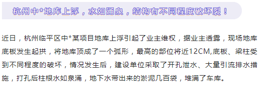 1、只重視地下室的梁、板、柱、墻的結(jié)構(gòu)構(gòu)件設(shè)計,忽視整體抗浮驗算分析,忽視施工的抗浮措施,總認為具有上萬噸自重的地下室不會浮起來;