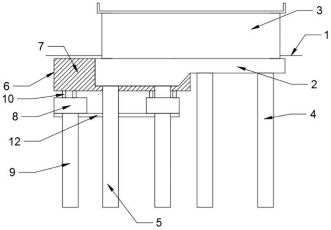本實(shí)用新型公開了一種用于橋梁下方新建隧道的樁基托換結(jié)構(gòu),包括:承臺(tái),所述承臺(tái)埋設(shè)于地面內(nèi),所述承臺(tái)底端設(shè)有樁基和被托換樁基,所述承臺(tái)頂端設(shè)有橋臺(tái);托換結(jié)構(gòu),所述托換結(jié)構(gòu)埋設(shè)于所述地面內(nèi),所述托換結(jié)構(gòu)設(shè)于所述承臺(tái)的一側(cè)。通過托換結(jié)構(gòu)在現(xiàn)有的承臺(tái)上進(jìn)行托換,使得托換結(jié)構(gòu)可以在各種條件下對(duì)既有的基礎(chǔ)進(jìn)行托換,以使得新修的地下隧道順利穿過。