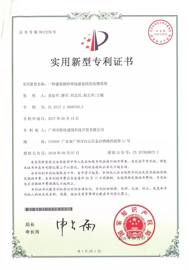 2018年9月7日由中華人民共和國國家知識產(chǎn)權(quán)局授予專利權(quán)(專利號ZL201720696765.2)。本實用新型提供一種建筑物特殊地基加固的處理系統(tǒng),當(dāng)壓樁過程中遇到砂石、孤石時,樁無法下沉?xí)r,本實用新型采用鋼管樁底開口,并加裝振動設(shè)備的改進(jìn)方式,通過振動設(shè)備對砂石、孤石破碎,使鋼管樁順利下沉。同時鋼管樁壁設(shè)有若干通孔,通孔用于鋼管樁向周邊土體灌漿加固。本實用新型提供了一種建筑物特殊地基加固的處理系統(tǒng),主要解決由于壓樁過程中通常會遇到砂石、孤石,壓樁無法下沉。