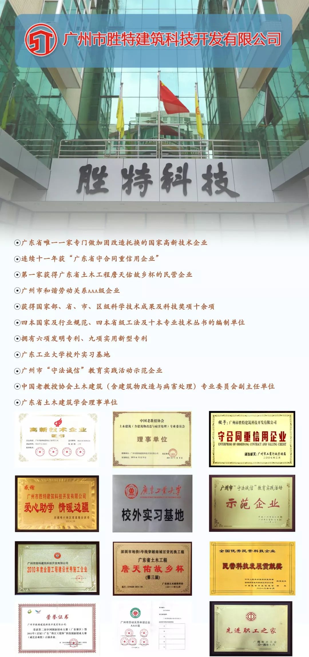 廣州市勝特建筑科技開發(fā)有限公司成立于1998年,當時注冊資金10萬元,現(xiàn)注冊資金1380萬元,公司于2012年獲得高新技術(shù)企業(yè)認證,2016年順利通過復審。公司以科研推動施工技術(shù)進步,以施工技術(shù)實踐轉(zhuǎn)換科技成果,通過不斷的技術(shù)創(chuàng)新,不但具有較強的開發(fā)與設計能力,更具有較高的現(xiàn)場施工能力。每年完成各種加固與改造、托換與糾傾及邊坡加固等工程二百余項,至今已完成四千余項特種工程設計與施工,攻克了一個又一個的技術(shù)難題。公司本著“優(yōu)勝、特別、務實、開拓”的企業(yè)精神,艱苦創(chuàng)業(yè),力求精益求精,做到了人無我有,人有我優(yōu)。憑借著二十年自身的雄厚實力和良好的信譽保障,本著精干、高效的原則,運用現(xiàn)代化的企業(yè)管理手段,相繼獨立完成了多項重大加固改造托換工程,業(yè)務范圍遍及全國各地,取得了很高的知名度與滿意度,樹起了良好的公司品牌形象,將“勝特”打造成中國加固改造行業(yè)的優(yōu)質(zhì)品牌。