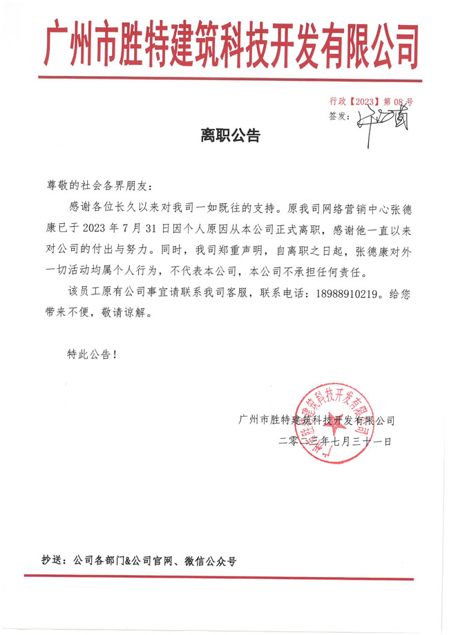 感謝各位長久以來對我司一如既往的支持。原我司網(wǎng)絡(luò)營銷中心張德康已于2023年7月31日因個(gè)人原因從本公司正式離職,感謝他一直以來對公司的付出與努力。同時(shí),我司鄭重聲明,自離職之日起,張德康對外一切活動(dòng)均屬個(gè)人行為,不代表本公司,本公司不承擔(dān)任何責(zé)任。