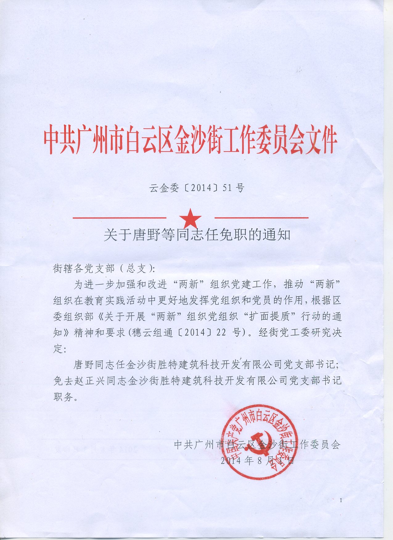 原金沙街勝特建筑科技開發(fā)有限公司黨支部書記趙正興同志身兼公司副總工一職,需長(zhǎng)期駐守在外重點(diǎn)工程項(xiàng)目,不能有效的開展黨建工作相關(guān)活動(dòng)。為進(jìn)一步加強(qiáng)和改進(jìn)“兩新”組織黨建工作,推動(dòng)“兩新”組織在教育實(shí)踐活動(dòng)中更好的發(fā)揮東組織和黨員的作用,根據(jù)區(qū)委組織部《關(guān)于開展“兩新”組織黨組織“擴(kuò)面提質(zhì)”行動(dòng)的通知》精神和要求(穗云組通[2014]22號(hào))經(jīng)中共廣州市白云區(qū)金沙街工作委員會(huì)研究決定,現(xiàn)免去趙正興同志金沙街勝特建筑科技開發(fā)有限公司黨支部書記職務(wù),正式任命唐野同志為金沙街勝特建筑科技開發(fā)有限公司黨支部書記。特此通知。