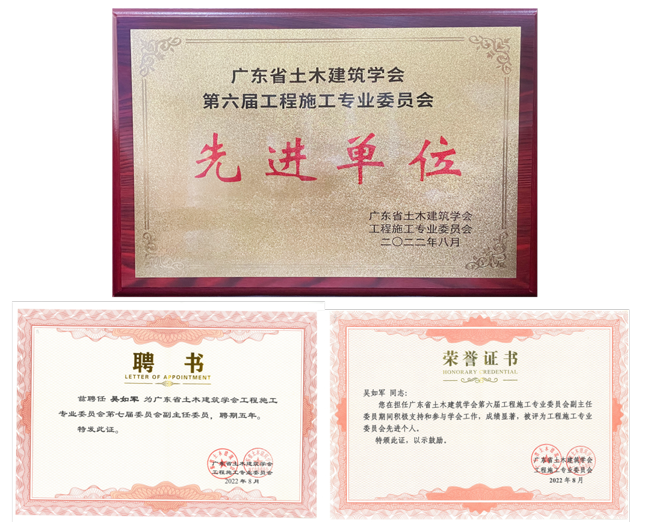 8月21日,廣東省土木建筑學(xué)會開展了“廣東省土木建筑學(xué)會工程施工專業(yè)委員會第七屆換屆大會”。在本次會議中,我司榮獲“廣東省土木建筑學(xué)會第六屆工程施工專業(yè)委員會先進單位”榮譽稱號;我司董事長吳如軍獲“廣東省土木建筑學(xué)會工程施工專業(yè)委員會先進個人”稱號及連任廣東省土木建筑學(xué)會工程施工專業(yè)委員會第七屆委員會副主任委員。