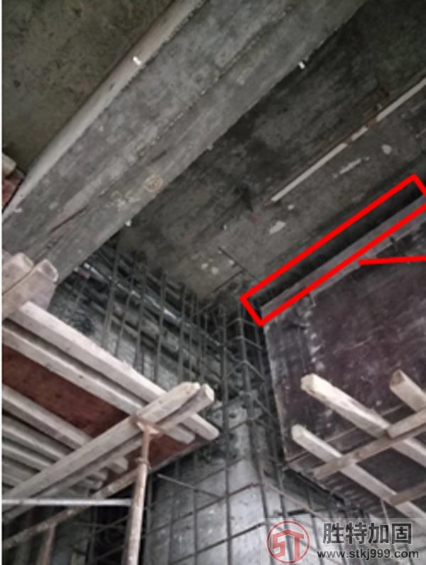 由于八樓宴會(huì)廳在使用中,七樓混凝土澆筑無法在板面開混凝土澆筑口,采用板下澆筑施工方法。所以梁側(cè)模分兩次安裝,第一次安裝必須在板下預(yù)留200mm作為澆灌口,第一次澆筑完成后再安裝上部側(cè)板,側(cè)模每1m留澆筑口。