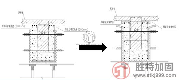 通過增設(shè)托換梁將兩根柱所承擔(dān)的荷載通過梁系轉(zhuǎn)換至周邊的豎向構(gòu)件。