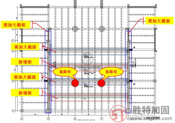 在被拆除柱增設(shè)四條轉(zhuǎn)換大梁,在轉(zhuǎn)換大梁兩端用加大截面法增加兩條大梁作為支座。