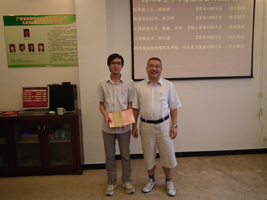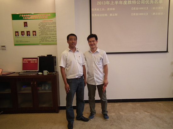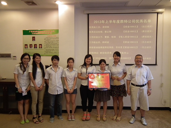 報(bào)告完畢后是勝特公司2013年上半年度優(yōu)秀員工頒獎(jiǎng),個(gè)人獲獎(jiǎng)?wù)哂校簝?yōu)秀施工員,優(yōu)秀項(xiàng)目經(jīng)理,工作積極分子分別為張琦和、工作敬業(yè)獎(jiǎng)、網(wǎng)絡(luò)營(yíng)銷微博優(yōu)秀獎(jiǎng);綜合研發(fā)中心獲得了部門獎(jiǎng)項(xiàng):積極響應(yīng)表現(xiàn)優(yōu)異獎(jiǎng)。