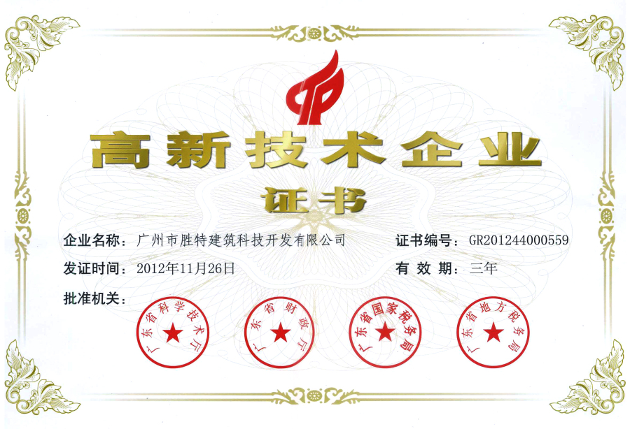 在建筑特種加固行業(yè)里,我司是首批獲得《高新技術(shù)企業(yè)》稱號(hào)的行業(yè)領(lǐng)跑者。今天的榮譽(yù),是鼓勵(lì)我們?cè)谖磥淼娜兆永锊粩鄤?chuàng)造精彩。廣州勝特加固改造將堅(jiān)定不移的高舉“綠色加固”旗幟揚(yáng)帆第三次創(chuàng)業(yè),為廣大建筑的安全使用及改造奉獻(xiàn)力量。