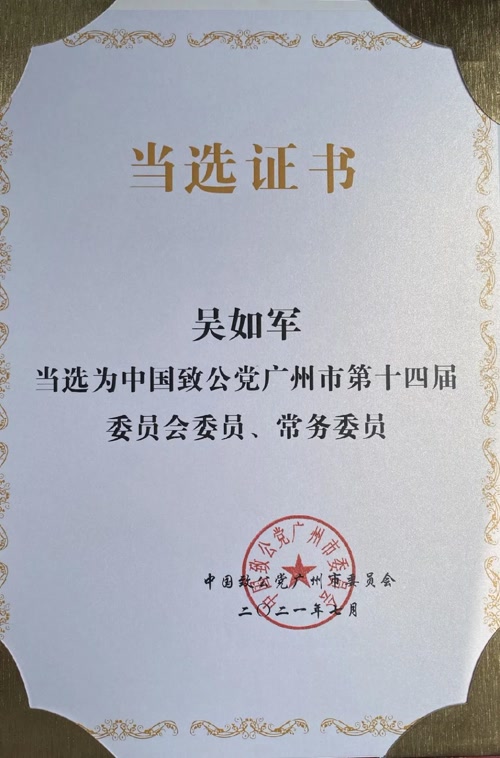 此外,今年8月31日中國致公黨廣州市委員會(huì)在廣州召開中國致公黨廣州市第十四次黨員代表大會(huì),吳如軍董事長當(dāng)選中國致公黨廣州市第十四屆常務(wù)委員會(huì)委員、常務(wù)委員職務(wù)。