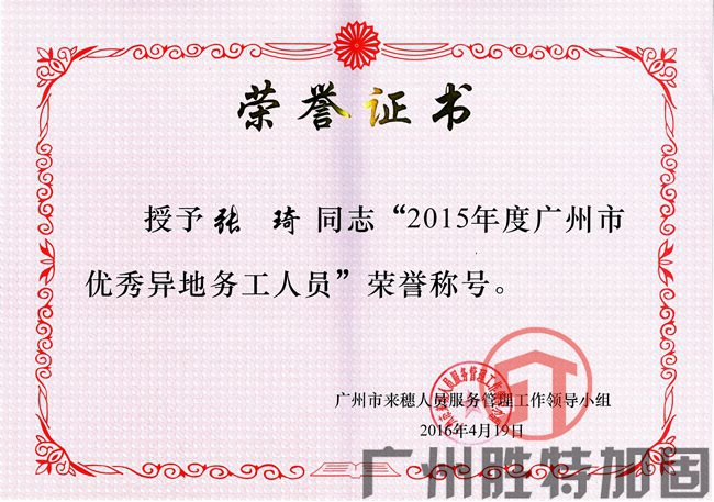 據(jù)了解,市共通報(bào)表彰確定的2015年度優(yōu)秀異地務(wù)工技能人才150名、優(yōu)秀異地務(wù)工人員50名、異地務(wù)工人員工作先進(jìn)集體50個(gè)。廣州市勝特建筑科技開發(fā)有限公司辦公室主任張琦先生榮獲“2015年度廣州市優(yōu)秀異地務(wù)工人員”榮譽(yù)稱號(hào)。