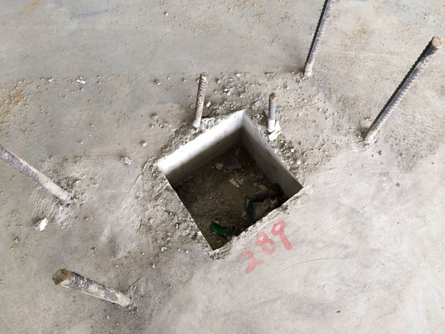 本工程主體結(jié)構(gòu)為單層多跨門(mén)式鋼架,基礎(chǔ)采用預(yù)應(yīng)力砼管樁、旋挖樁及獨(dú)立基礎(chǔ)等多種形式。由于地層中含有淤泥質(zhì)土層且未進(jìn)行有效處理,導(dǎo)致4-8軸線內(nèi)的地面出現(xiàn)明顯的沉陷與開(kāi)裂,多表現(xiàn)在倉(cāng)儲(chǔ)和通道區(qū)域。廠房?jī)?nèi)部該部分區(qū)域用作倉(cāng)庫(kù)和車(chē)輛通道,使用荷載較重,也是導(dǎo)致地面下沉和開(kāi)裂的一個(gè)原因,由于嚴(yán)重影響到主廠房的正常使用,根據(jù)業(yè)主要求對(duì)原地面結(jié)構(gòu)進(jìn)行加固處理。整個(gè)地坪基礎(chǔ)加固過(guò)程,我司共拆除原素混凝土地板17280㎡、新做結(jié)構(gòu)地板17280㎡、群錨靜壓樁780根。該工程用到的群錨靜壓樁專(zhuān)利技術(shù)(ZL201120281350.1)后續(xù)也多次運(yùn)用在同類(lèi)型基礎(chǔ)加固工程當(dāng)中,并體現(xiàn)出很好的處理效果。