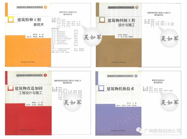 本書是公司十五年來高難度工程的典型案例及各種特種新技術(shù)的匯編,涉及的工程類型包括結(jié)構(gòu)加固、基礎(chǔ)加固、改造、糾傾、托換,并介紹了部分自有專利技術(shù)。吳如軍董事長(zhǎng)為該書主編人,該書已于2014年1月1日起發(fā)行,在各大書店有售。
