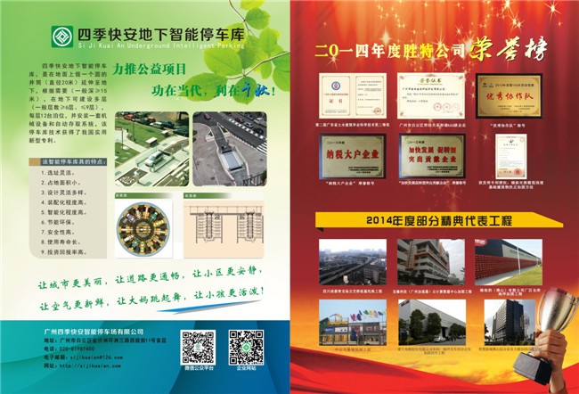 二、廣州四季快安智能停車場有限公司簡介及相關(guān)資訊報道:四季快安智能停車庫是2014年李克強總理從意大利引進的成熟技術(shù),僅需20米直徑的空間,深15至20m,即可建成停放108輛車位的地下智能車庫,車庫內(nèi)設(shè)有消防、防排水、照明、排風(fēng)、檢修走道等附屬設(shè)施,車庫建成后,車庫出入口僅占35平方,其它將還路于民,還廣場于民,還公園于民。該車庫建設(shè)總投資約2000~2500萬元,土建施工時間100天,機械安裝調(diào)試60天,其中建筑結(jié)構(gòu)保用90年,機械系統(tǒng)保用50年。該車庫特點:每車停、取車時間45秒,操作方便,人不用下車庫。若需要停放更多的車輛也可實施。