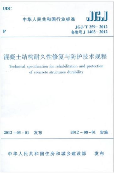 中華人民共和國行業(yè)標(biāo)準(zhǔn)《混凝土結(jié)構(gòu)耐久性修復(fù)與防護(hù)技術(shù)規(guī)程》JGJ/T 259-2012以下簡(jiǎn)稱《規(guī)程》,2012年8月1日起實(shí)施?!兑?guī)程》由中冶建筑研究總院有限公司、國家工業(yè)建筑診斷與改造工程技術(shù)研究中心、上海房地產(chǎn)科學(xué)研究院、南京水利科學(xué)研究院、中國建筑材料科學(xué)研究總院、中國京冶工程技術(shù)有限公司、武漢理工大學(xué)、清華大學(xué)、北京交通大學(xué)、鐵路部運(yùn)輸局、廣東省建筑科學(xué)研究院、廣州市勝特建筑科技開發(fā)有限公司等14家單位參編,適用于工業(yè)與民用建筑施工。