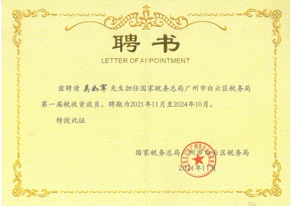 白云區(qū)稅務(wù)局領(lǐng)導(dǎo)為13名稅收資政員頒發(fā)聘書,我司吳如軍董事長作為廣州市第十五屆人大代表、白云區(qū)第十七屆人大常委委員會委員受聘任為白云區(qū)首屆稅收資政員之一。
