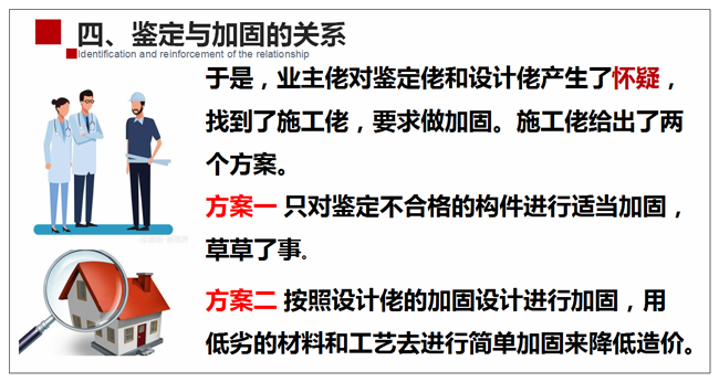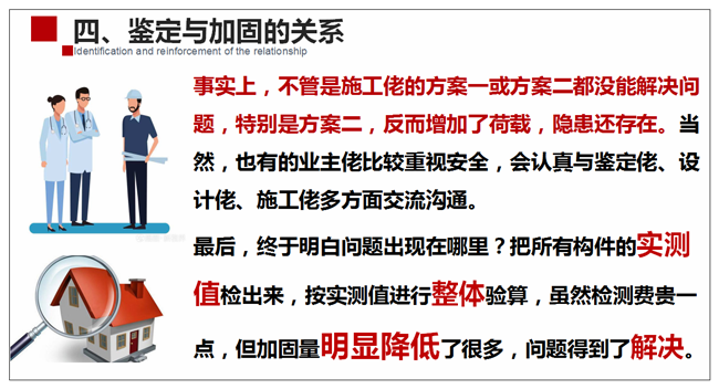 所以呢,不管是可靠性鑒定、抗震性鑒定等等的鑒定報(bào)告都只是證明這棟建筑有沒有問題,但不能把鑒定報(bào)告作為加固的依據(jù),有問題的需要加固,可以采取補(bǔ)充抽檢,最起碼豎向構(gòu)建、大跨度梁等等要弄清楚,這是我對(duì)鑒定與加固的一些思考。