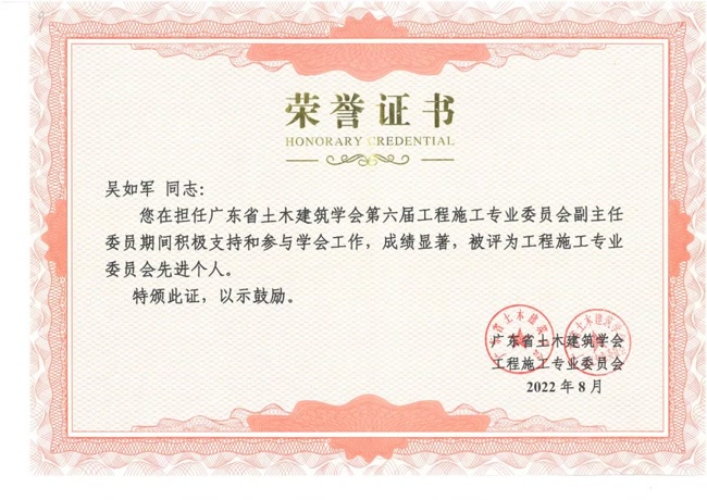 在本次會(huì)議中,我司榮獲“廣東省土木建筑學(xué)會(huì)第六屆工程施工專業(yè)委員會(huì)先進(jìn)單位”榮譽(yù)稱號(hào);我司董事長(zhǎng)吳如軍獲“廣東省土木建筑學(xué)會(huì)工程施工專業(yè)委員會(huì)先進(jìn)個(gè)人”稱號(hào)及連任廣東省土木建筑學(xué)會(huì)工程施工專業(yè)委員會(huì)第七屆委員會(huì)副主任委員。