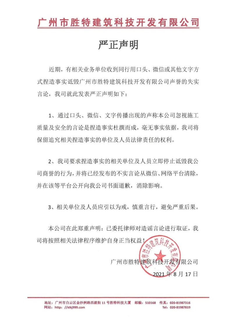 近期,有相關(guān)業(yè)務(wù)單位收到同行用口頭、微信或其他文字方式捏造事實(shí)詆毀廣州市勝特建筑科技開(kāi)發(fā)有限公司聲譽(yù)的失實(shí)言論,我司就此發(fā)表嚴(yán)正聲明如下: