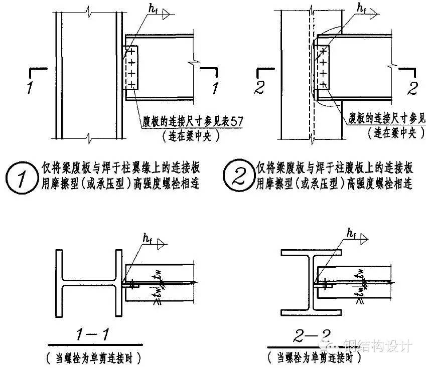 梁與柱的鉸接連接分為:僅梁腹板連接、僅梁翼緣連接: