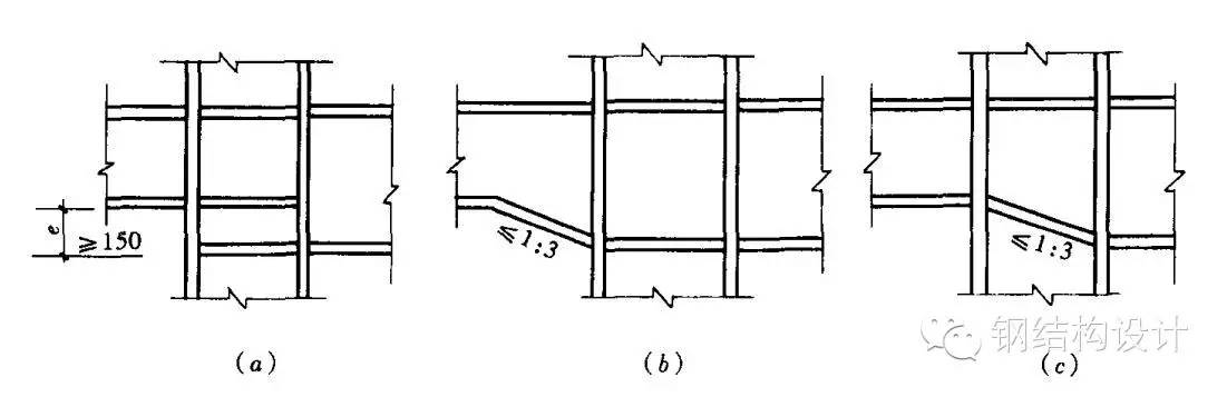 當(dāng)柱兩側(cè)的梁不等高時(shí),應(yīng)按兩側(cè)梁的高差分別考慮。當(dāng)梁高差大于150mm時(shí),應(yīng)在兩側(cè)梁翼緣高度的分別設(shè)置加勁板;當(dāng)梁高差小于150mm時(shí),應(yīng)將梁高較小的梁端做成變截面,變截面坡度小于1:3,或者設(shè)置傾斜的加勁板。