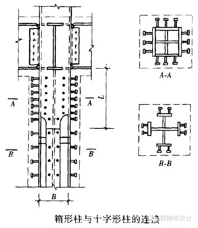 高層鋼結(jié)構(gòu)中的箱形柱與下部型鋼混凝土中的十字形柱相連時(shí),應(yīng)考慮截面形式變化處力的傳遞平順。箱形柱的一部分力應(yīng)通過栓釘傳遞給混凝土,另一部分力傳遞給下面的十字形柱,如下圖所示。兩種截面的連接處,十字形柱的腹板應(yīng)伸入箱形柱內(nèi),形成兩種截面的過渡段。伸入長度應(yīng)不小于柱寬加200mm,即L≥B+200mm,過渡段截面呈田字形。過渡段在主梁下并靠緊主梁。