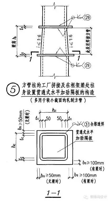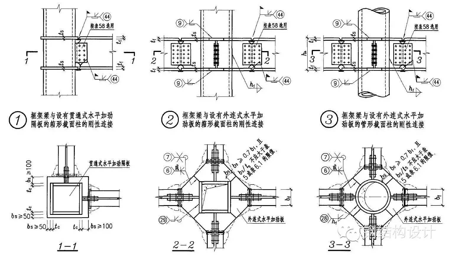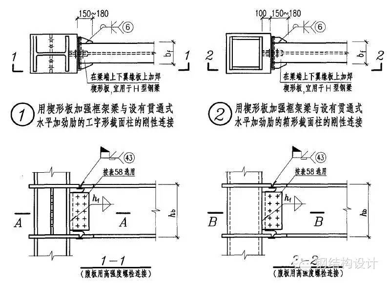 (1)工字形梁與工字形柱或箱形柱剛性連接的細(xì)部構(gòu)造: