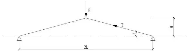基于此,再看以下示例:有兩根相互鉸接的二力桿,兩端是鉸接支座,支座間距為2L,假設L為常數,θ為變量,中間受到一個豎直向下的集中力F作用,如圖2所示。