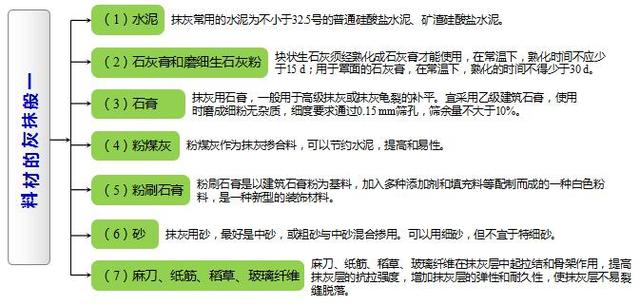 水泥標號應不低于32.5號,其安定性試驗必須合格;砂料應堅硬潔凈,其中粘土、泥灰粉末等含量不超過3% ,過篩后不得含有雜物,石灰膏必須經(jīng)過塊狀淋制,并經(jīng)過3 mm方篩孔過濾,熟化時間不少于15 d。紙筋石灰宜集中加工,紙筋要磨細,且熟化時間不少于15 d。為了控制抹灰層的厚度和平整度,抹灰前必須先找好規(guī)矩,即四角規(guī)方、橫線找平、立線吊直、彈出準線和墻裙、踢腳板線。